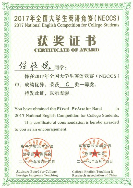 我校学子在2017全国大学生英语竞赛中喜获佳绩