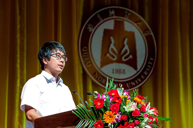 校长戚万学在典礼上致辞。戚万学代表学校向圆满完成学业的毕业生表示热烈祝贺,向为同学们的成长付出心血的老师、家长及社会各界表达最诚挚的谢意和敬意。面对即将扬帆起航的学子,他饱含深情地说:毕业了,你们有理由庆贺,因为四年来你们不断突破自己,终于破茧成蝶。大学的青春,将定格在这里;曲园的情怀,将牵起你们与这所大学一生相连,一直烙印和珍藏心间。戚万学说,六十余载砥砺耕耘,赢得万千芬芳,曲阜师大从未放弃对文化薪火相传的承诺,并以特有的品质与追求书写了孔子家乡兴教育人的“杏坛新篇”。曲园见证了同学们的努力与成长,同学们对曲园传统和精神的承当,终将使这所大学非同凡响。在新的一页即将翻开之际,戚万学以一名师者、长者的身份期盼同学们,做事时多点耐心,从容执着,因为坚持、坚守、从容较之折腾、闹腾、焦躁更要紧,更有意义;处世时守住良心,多点真诚,在变革的时代守护公义、懂得奉献绵薄、尊重他人、服务社会,不辜负自己、不辜负这个时代。戚万学最后寄语毕业生“世界很大、很精彩,背起行囊,送你出发。良心、耐心、责任、坚韧,将永远照亮你回家的路。累了,想了,静轩西路57号,等你回家!”