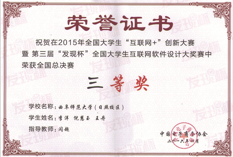 4月9日,由中国电子商务协会、杭州市商务委员会和杭州经济技术开发区共同举办全国大学生“互联网+”创新大赛暨第三届“发现杯”全国大学生互联网软件设计大奖赛全国总决赛在杭州电子科技大学举行。我校信息科学与工程学院两支参赛队伍取得了“全国总决赛三等奖”的好成绩。