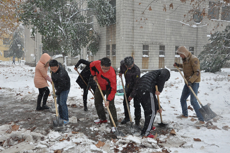党委书记荆兆勋、校长戚万学等学校领导和师生一起,拿起清扫工具清理积雪。零下5度的低温,再度飘洒的雪花,加上凛冽的北风,增加了除雪的难度。师生们的手和脸都冻得通红,头发被雪水和汗水浸湿,但这丝毫没有影响大家的工作热情和效率。师生们团结协作,经过三个多小时的奋战,除雪工作取得了明显的效果。