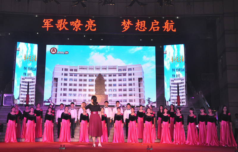晚会采取台上文艺节目表演、台下新生军歌合唱穿插进行的形式,台上台下相互联动,所有2015级新生都既是观众、又是演员。军歌合唱由我校各学院共12支代表队参加,一支支红歌,一片片真情,《强军战歌》唱出了同学们的强军梦想以及献身强军实践的决心和壮志豪情,《走向复兴》的歌声充满希望,传达了同学们建设美好未来的理想和信念,《众人划桨开大船》铿锵有力,歌颂了齐心协力,团结互助的优良传统。2015级新生在接受了半个月的军训洗礼后,他们高昂的用军歌把热血的青春再度点燃,鼓声、乐声、朗诵声、呐喊声在聚光灯下交织出一篇华美乐章。今年正值抗战胜利七十周年和我校建校六十周年,这在夜空中回响的阵阵军歌是曲园学子对祖国,对母校最好的献礼。
