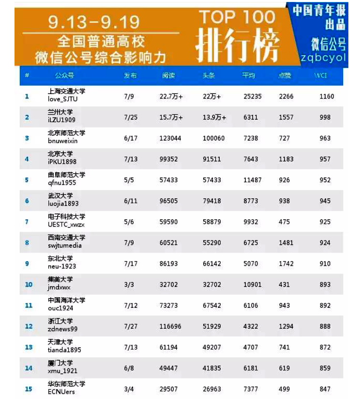 9月21日,中国青年报发布了最新的“中国高校微信公号综合影响力排行榜”,我校官方微信继2015年4月27日排行全国高校第28名后,当周跃升至全国高校第5名,再次实现突破。