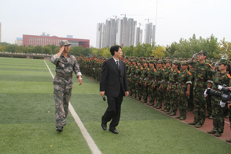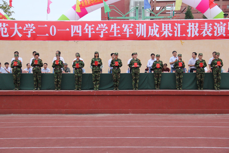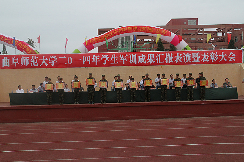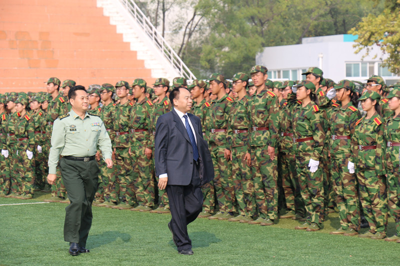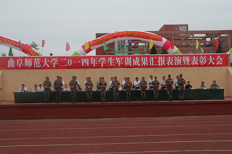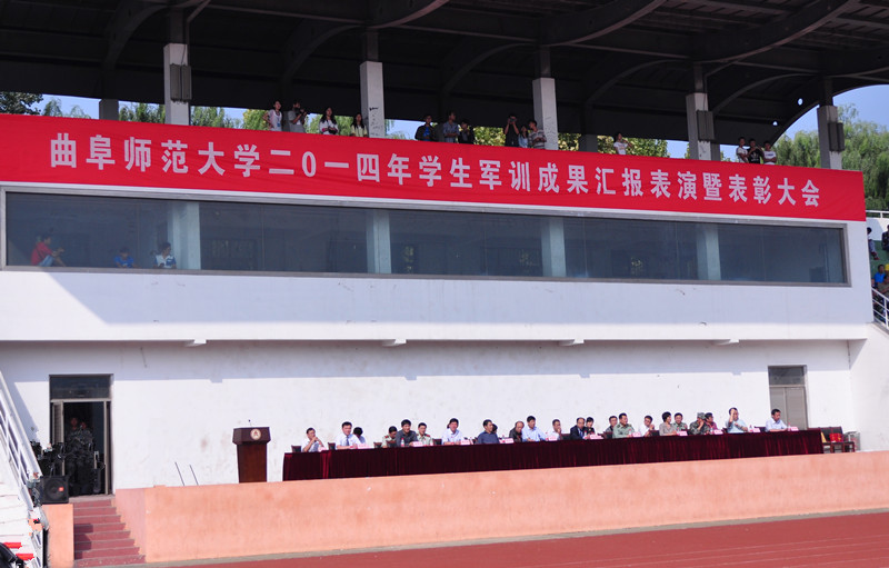 9月23日,我校2014级军训汇报表演暨总结表彰大会在两校区隆重举行。学校领导荆兆勋、傅永聚、刘新生、孙文亮、马东骅、康淑敏、扈庆学、郭辰夫、杨冰,日照市委副秘书长、大学科技园工委书记王均波,济宁预备役炮兵师第二团团长李健,山东陆军预备役炮兵师第一团副团长、军训团团长李建勋,济宁预备役炮兵师第二团政治处主任、军训团团长孙伟,以及学校有关部处负责人和各学院党总支副书记出席大会并在主席台就坐。大会分别由日照校区机关党总支书记兼学生工作办公室主任孔令军、校团委书记屈跃宽主持。