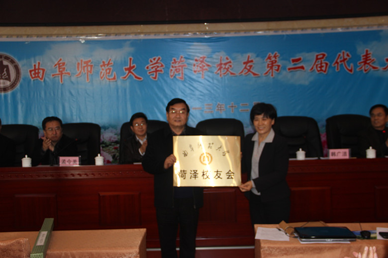 康淑敏代表学校向菏泽校友会颁授会牌,并赠送了由我校副校长马东骅题写的书法作品:曲园弦歌,曹州芳华。