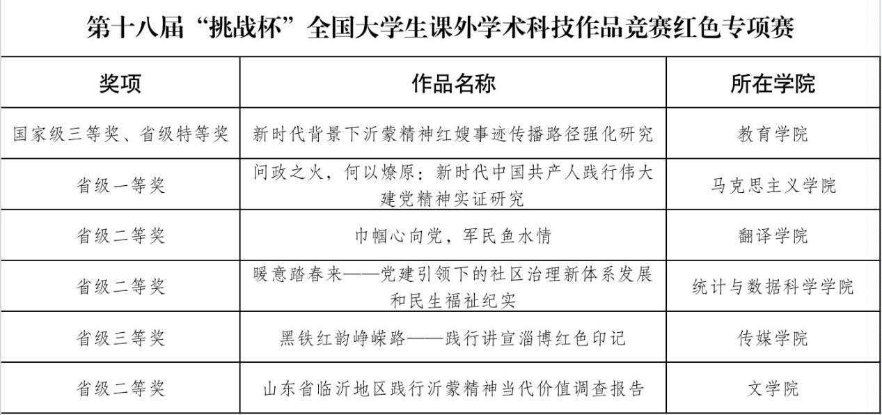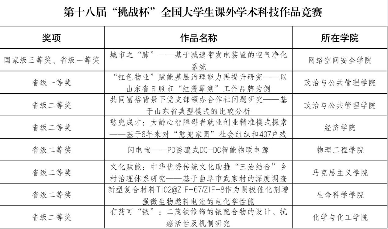 曲阜师大团委讯 近日,第十八届“挑战杯”全国大学生课外学术科技作品竞赛在贵州大学落下帷幕,我校荣获主体赛国家三等奖1项,省级一等奖2项、二等奖6项;获红色专项赛国家三等奖1项,省级特等奖1项、一等奖1项、二等奖2项、三等奖2项。