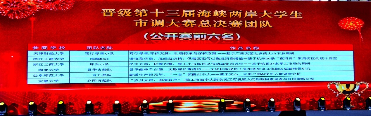 统计与数据科学学院讯 6月1日至2日,第十四届全国大学生市场调查与分析大赛本科组&在华留学生组总决赛在合肥工业大学举办。统计与数据科学学院2021级本科生陈添硕、马亚楠、李文静、张鑫荣和袁艺琳在陈志成老师的指导下,以全国第五名的成绩荣获一等奖并晋级海峡两岸大学生市调大赛。这不仅是曲阜师大在该项赛事中取得的最好成绩,也是山东省高校首次晋级海峡两岸大学生市调大赛,实现了山东赛区的历史性突破。