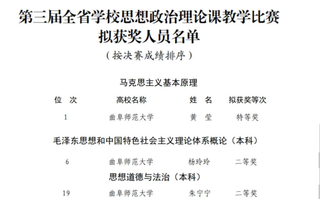 曲阜师大马克思主义学院讯  近日,山东省教育厅公示了第三届全省学校思想政治理论课教学比赛拟获奖人员名单,马克思主义学院三位教师参赛并全部获奖,其中,黄莹老师荣获马克思主义基本原理课程的特等奖,杨玲玲、朱宁宁老师分别荣获毛泽东思想和中国特色社会主义理论体系概论、思想道德与法治课程的二等奖。