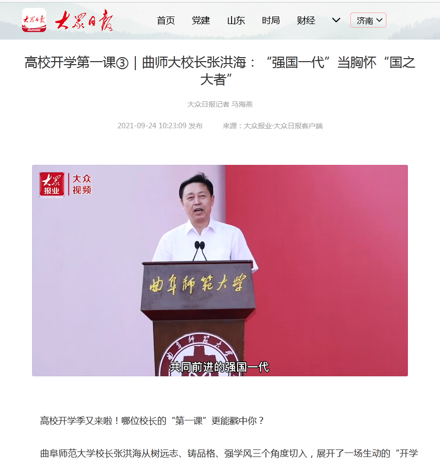 大众日报:开学第一课,曲师大校长张洪海寄语“强国一代”当胸怀“国之大者”
