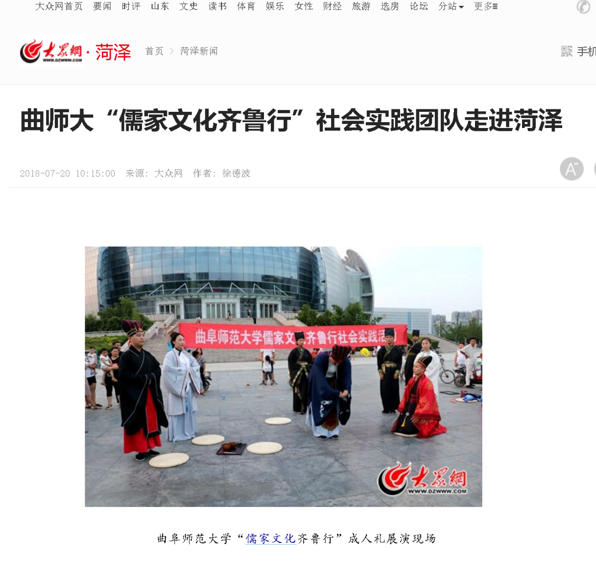 7月18日—21日,我校历史文化学院“儒家文化齐鲁行”社会实践团队前往菏泽、泰安、济宁等地开展社会实践活动。实践队员们在菏泽牡丹广场、泰安宁阳复圣公园以及曲阜东方儒家花园酒店等地进行成人礼的展演,并面向不同社会群体就“家庭成人礼推广的可行性”展开调研活动,吸引了众多市民的广泛关注与支持。活动也受到大众网、齐鲁网、牡丹晚报、今日头条等多个媒体的报道。