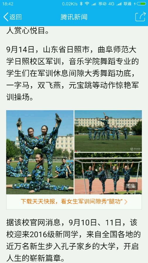 腾讯新闻:曲师大新生军训 舞蹈专业学生大秀舞功