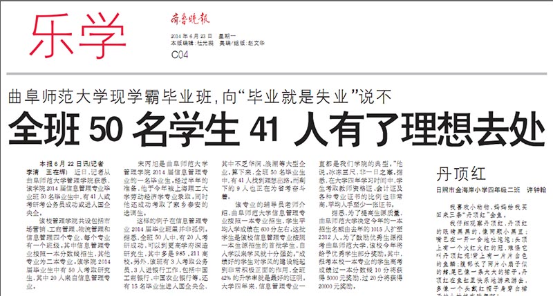 齐鲁晚报:曲师大现学霸毕业班 50名学生41人有了好去处