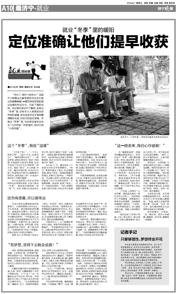6月7日,《济宁晚报》用一个整版刊发通讯报道,向广大读者介绍了我校应届毕业生单联华、魏星以优异成绩分别考取华东师范大学和中国人民大学公费研究生,以及小张顺利进入沿海一家外企就业的消息;并配发记者手记《 只要够理性,梦想终会开花》,对曲园学子脚踏实地、勇于拼搏、超越自我的精神给予了高度评价。