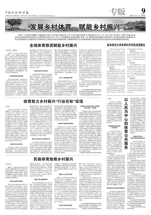 曲阜师大体育科学学院讯 日前,中国社会科学报在“发展乡村体育、赋能乡村振兴”专版中刊登了江南在线登录入口山东省乡村振兴体育研究院执行副院长曹莉教授团队的系列成果,其内容包括:体育助力乡村振兴“行动目标”、构建以人民为中心的体育公共服务、全域体育旅游赋能乡村振兴、民俗体育助推乡村振兴等主题的阶段性战略研究。报道还对学校体育科学学院近年来取得的相关成绩进行了列举,相关科研成果为全国农村体育发展提供理论依据和现实借鉴,标志着团队的研究在乡村体育领域处于省内领先地位、对全国乡村体育研究形成较大影响。