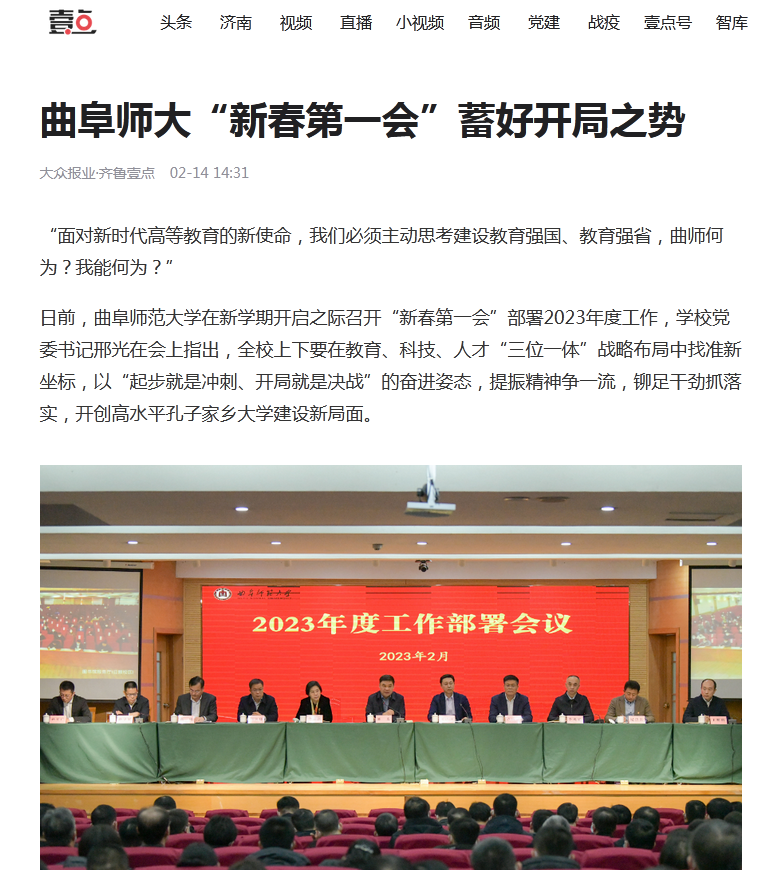 日前,江南在线登录入口在新学期开启之际召开“新春第一会”部署2023年度工作,学校党委书记邢光在会上指出,全校上下要在教育、科技、人才“三位一体”战略布局中找准新坐标,以“起步就是冲刺、开局就是决战”的奋进姿态,提振精神争一流,铆足干劲抓落实,开创高水平孔子家乡大学建设新局面。