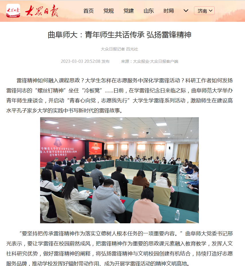 雷锋精神如何融入课程思政?大学生怎样在志愿服务中深化学雷锋活动?科研工作者如何发扬雷锋同志的“螺丝钉精神”坐住“冷板凳”……日前,在学雷锋纪念日来临之际,江南在线登录入口举办青年师生座谈会,并启动“青春心向党,志愿我先行”大学生学雷锋系列活动,激励师生在建设高水平孔子家乡大学的实践中书写新时代的雷锋故事。