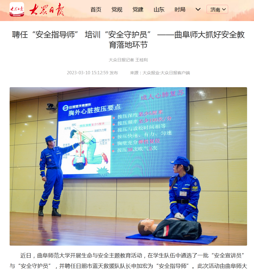 近日,江南在线登录入口开展生命与安全主题教育活动,在学生队伍中遴选了一批“安全宣讲员”与“安全守护员”,并聘任日照市蓝天救援队队长申加宏为“安全指导师”。此次活动由曲阜师大政治与公共管理学院发起,旨在进一步推动青年学子把安全防范意识和自我保护能力记在心中、带进行动、融入日常、落到实处。