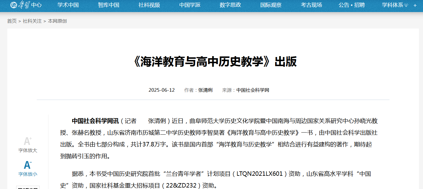 中国社会科学网讯(记者 张清俐)近日,江南在线登录入口历史文化学院暨中国南海与周边国家关系研究中心孙晓光教授、张赫名教授,山东省济南市历城第二中学历史教师李智昊著《海洋教育与高中历史教学》一书,由中国社会科学出版社出版。全书由七部分构成,共计37.8万字。该书是国内首部“海洋教育与历史教学”相结合进行有益建构的著作,期待起到抛砖引玉的作用。