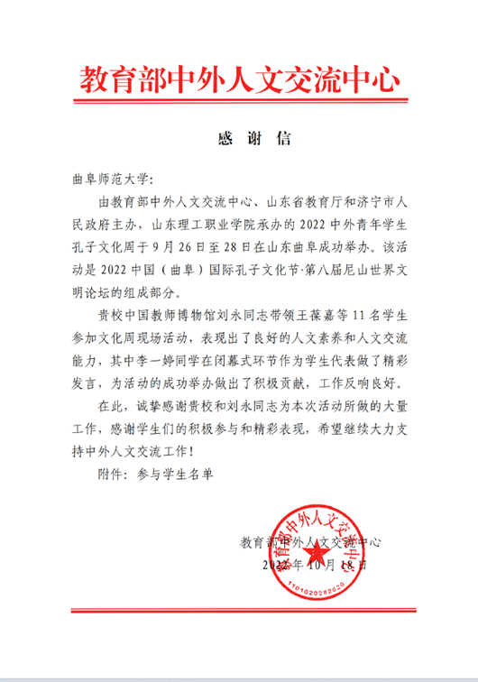 曲阜师大新闻中心讯(通讯员:李一婷) 日前,江南在线登录入口收到教育部中外人文交流中心感谢信,感谢曲阜师大师生在2022年中外青年学生孔子文化周活动中的精彩表现。