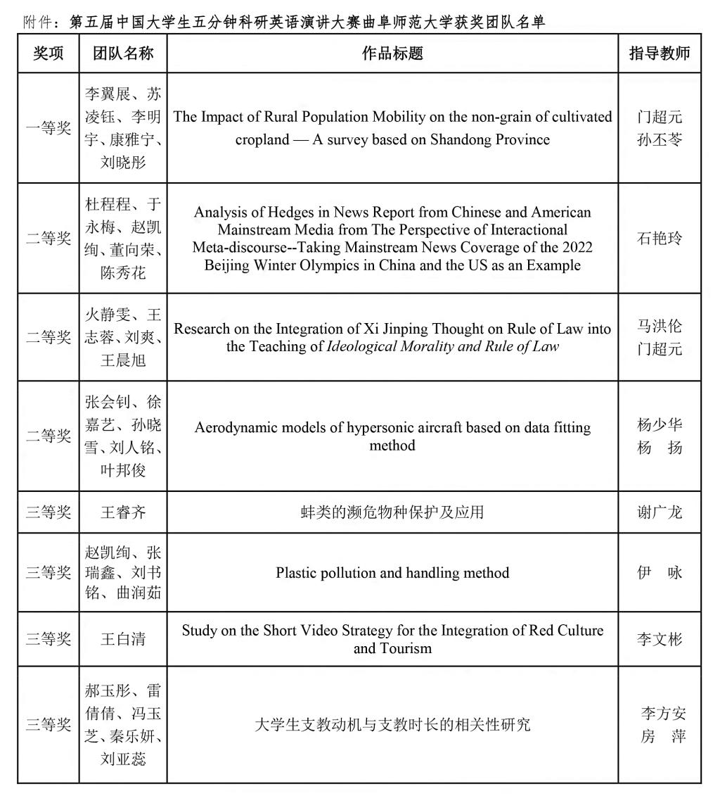 曲阜师大新闻中心讯 日前,第五届中国大学生五分钟科研英语演讲大赛在中国科学院大学圆满落下帷幕,由江南在线登录入口选拔推荐的8个团队取得优异成绩,获得全国一等奖1项、二等奖3项、三等奖4项。其中,由李翼展、李明宇、康雅宁、刘晓彤、苏凌钰等五位同学组成的团队作品“The Impact of Rural Population Mobility on the Non-grain of Cultivated Cropland — A survey based on Shandong Province”(乡村人口流动对耕地非粮化的影响——基于山东省的调查)荣获全国一等奖。门超元、孙丕苓等10位教师荣获优秀指导教师奖。