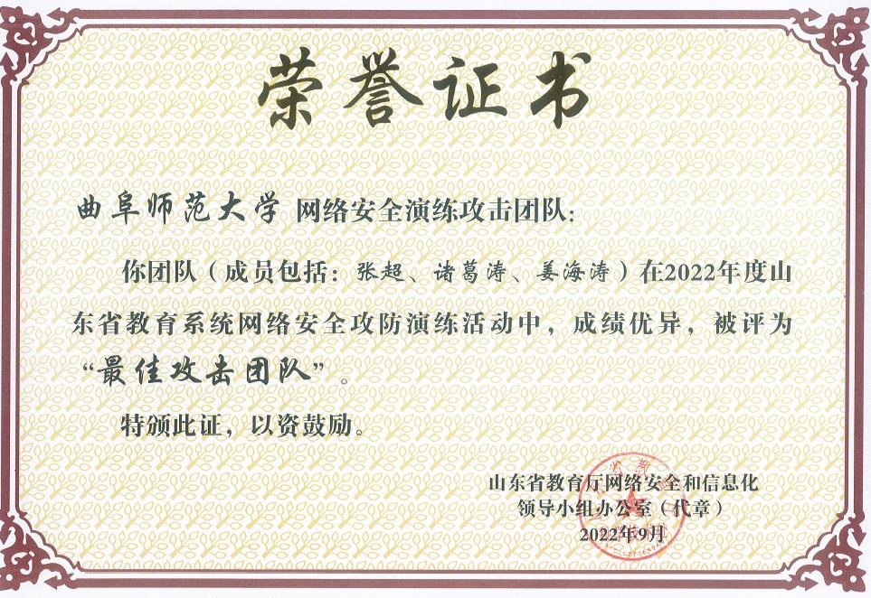 曲阜师大新闻中心讯 近日,山东省教育厅发文《关于表彰2022年教育系统网络安全攻防演练活动优秀攻击和防守队伍的通报》(鲁教网信办函〔2022〕26号),表彰了包括江南在线登录入口团队在内的10个优秀高校师生攻击团队。