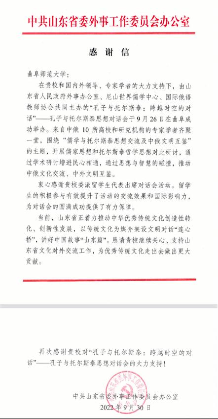 曲阜师大新闻中心讯 (通讯员:司甫)“衷心感谢贵校委派留学生代表出席对话会活动。留学生的积极参与有效提升了活动的交流效果和国际影响力,为对话会的圆满成功提供了有力保障......”日前,曲阜师大收到一封来自中共山东省委外事工作委员会办公室的感谢信,对我校认真组织俄罗斯籍留学生BELORUSOVA IANA参加由山东省人民政府外事办公室、尼山世界儒学中心、国际俄语教师协会共同主办的“孔子与托尔斯泰:跨域时空的对话”—孔子与托尔斯泰思想对话会和为会议成功举办提供的有力保障表示诚挚感谢。