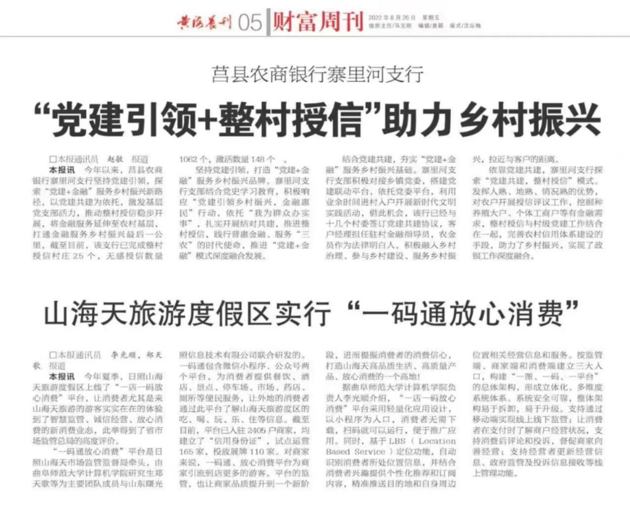 据了解,“一店一码放心消费”平台包含微信小程序、公众号两个平台,为消费者提供餐饮、酒店、景点、停车场、市场、药店、厕所等便民服务,让外地的消费者通过此平台了解山海天旅游度区的吃、喝、玩、乐、住等信息。截至目前,平台已入驻2405户商家,均建立了“信用身份证”,试点运营165家,投放展牌110家,,被《黄海晨刊》、《闪电新闻》等多家媒体报道宣传。
