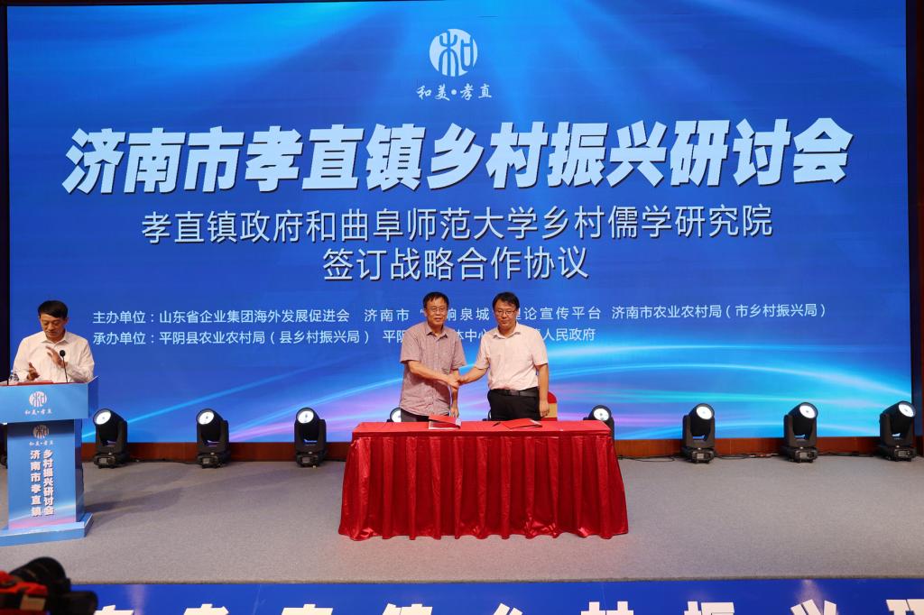 仪式上,王钧林教授与平阴县孝直镇党委副书记刘波分别代表江南在线登录入口乡村儒学研究院和孝直镇政府在合作协议书上签字。
