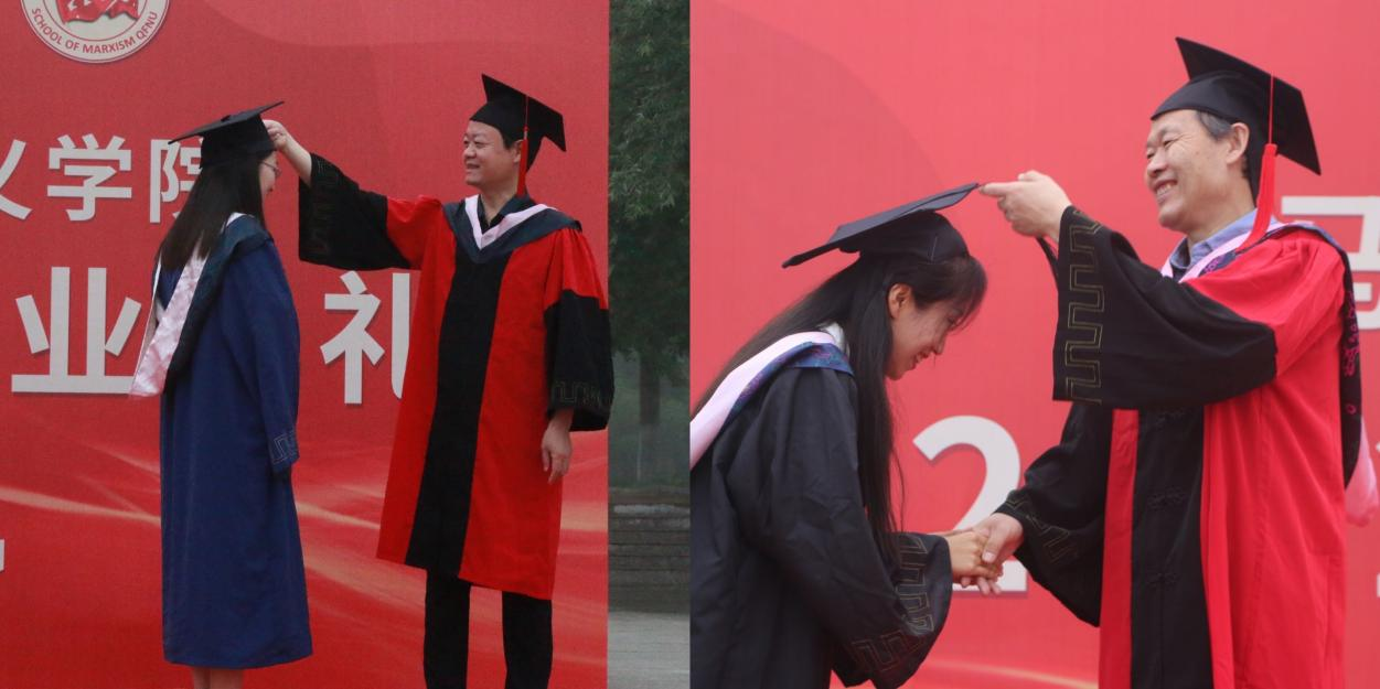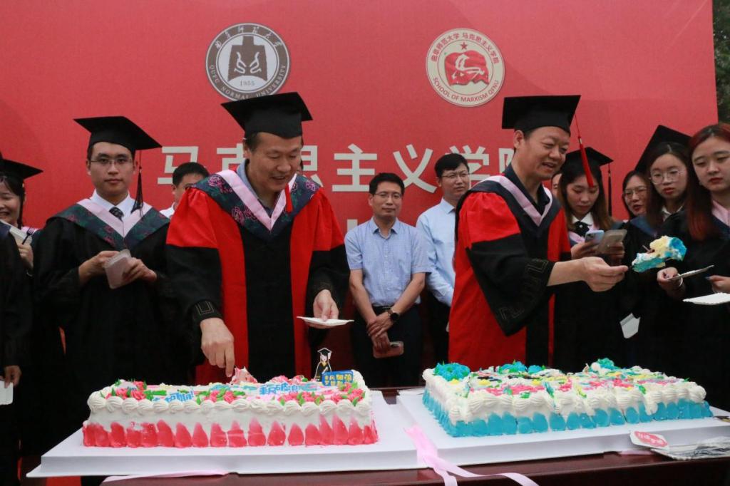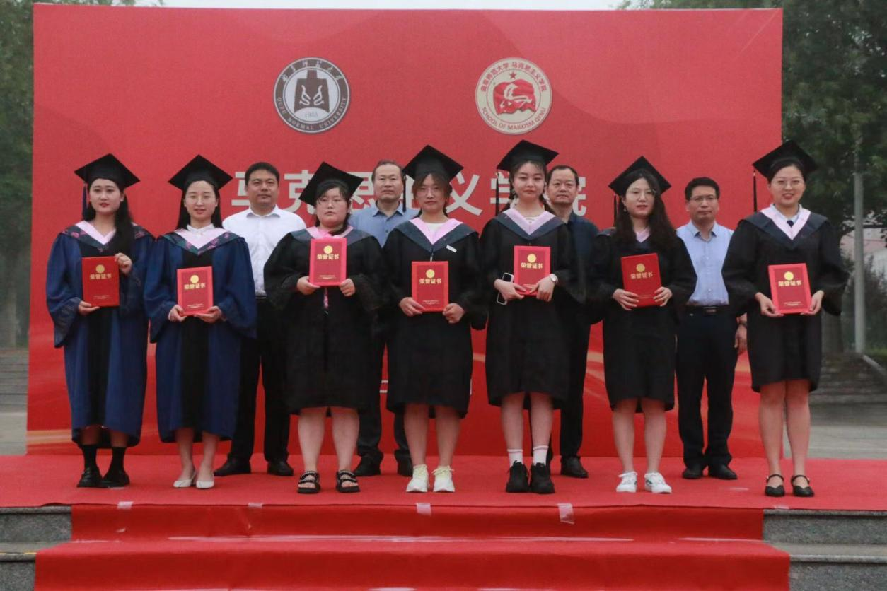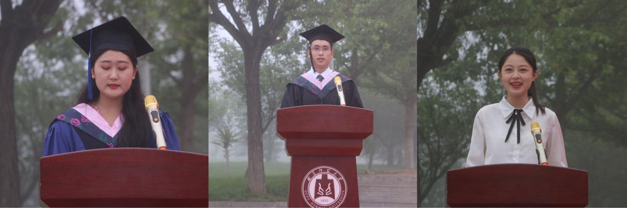 毕业生代表潘金倩、韩凯乙祝福同学们能够秉持学而不厌,诲人不倦的校训和高扬旗帜,传播真理,育人铸魂,不辱使命的院训,继续乘风破浪,直济沧海,并祝福学校和学院各项事业蓬勃发展。在校生代表张宇涵,表达了对毕业生的感谢,表示会传承好学院优良学风,努力成为坐下来能写、站起来能说、走出去能干的合格马院人。
