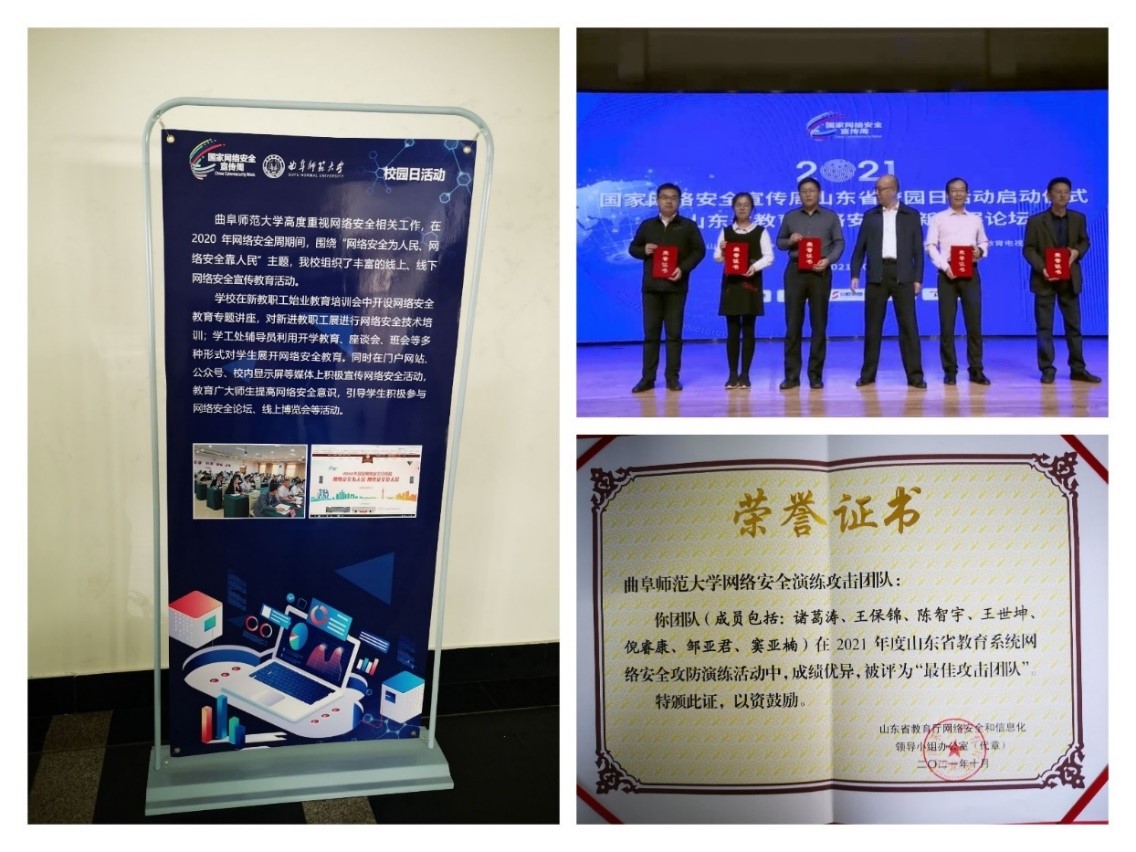 参加网络攻防演练提升保障能力,在2021年度山东省教育系统网络安全攻防演练活动中,江南在线登录入口网络信息中心组织的网络安全演练攻击团队被评为“最佳攻击团队”,受邀出席2021年国家网络安全宣传周山东省校园日活动,面向全省教育行业同仁,做了“高校网络安全的平衡之道”专家报告。通过对抗、复盘和研讨,更加完善了安全事件的监测发现能力和应急处置能力,稳步提高了网络安全风险意识。