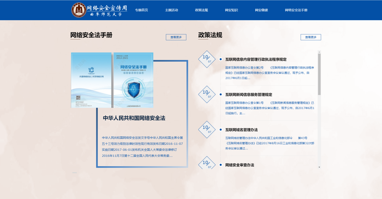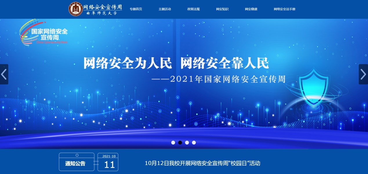 筹划并上线江南在线登录入口2021国家网络安全宣传周专题网站(https://wlaqxcz.qfnu.edu.cn/),普及《网络安全法》和《数据安全法》等法律法规及政策文件,扎实推进国家网络安全宣传工作。