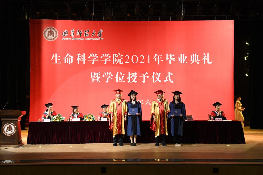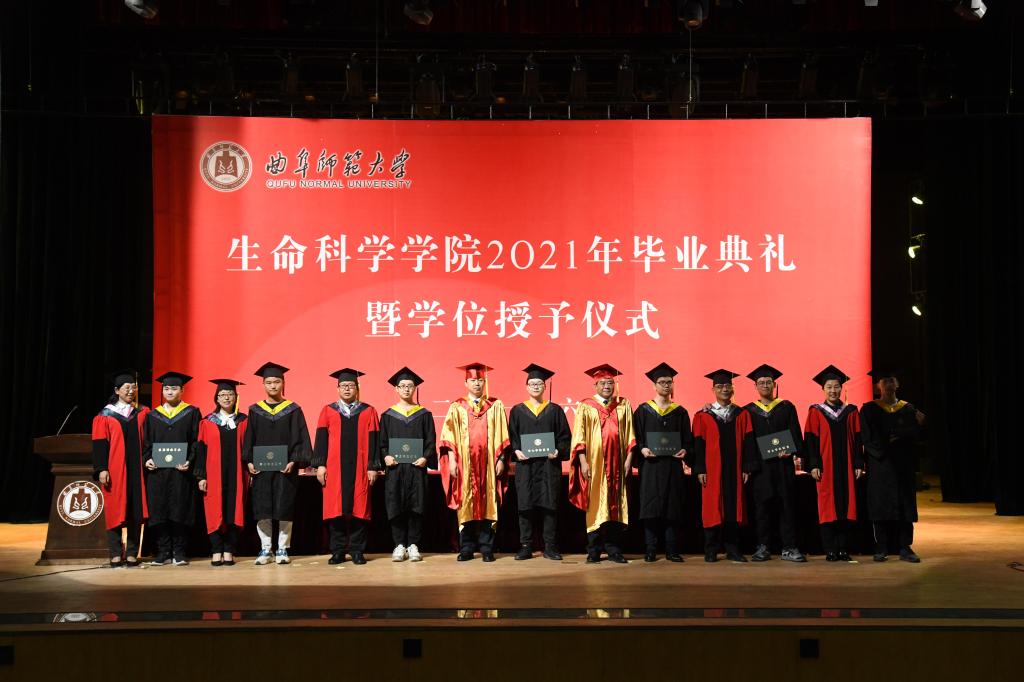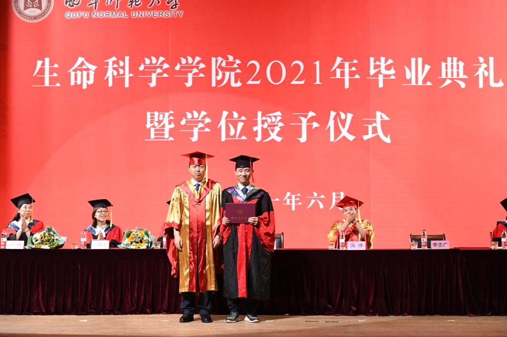 曲阜师大新闻中心讯 6月25日上午九点,生命科学学院2021年毕业典礼暨学位授予仪式在大学生活动中心礼堂举行。校长、校学位评定委员会主席张洪海,副校长、校学位评定委员会副主席冯冲出席毕业典礼拨穗正冠、颁授证书。生命科学学院党委书记李志广、院长杨月伟、院党委副书记张明洁、副院长王仁君、院长助理燕艳和教师代表,与全体本、硕、博毕业生共同参与、见证毕业时刻。活动由李志广主持。