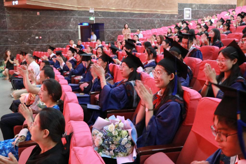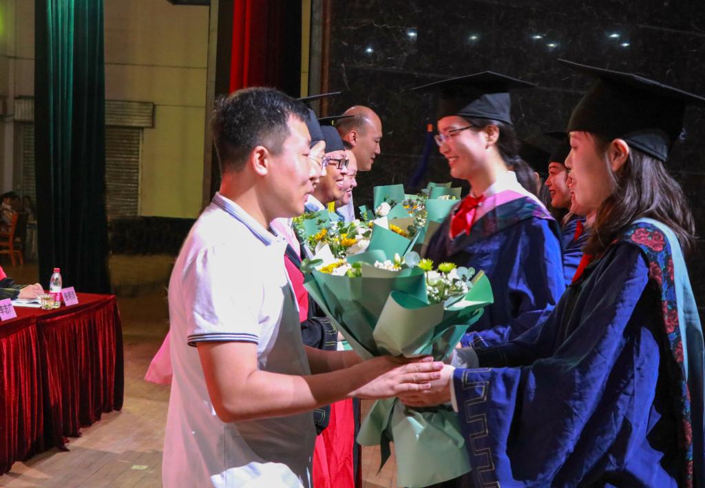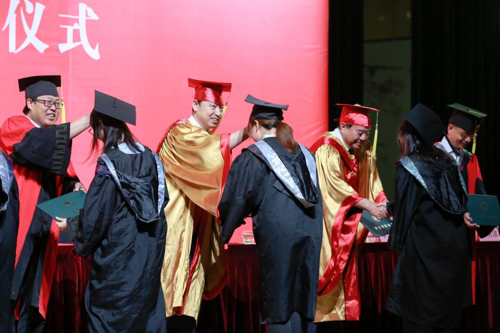 在庄重的乐曲声中,毕业生们意气风发走上主席台,校学位评定委员会主席张洪海、校学位评定委员会副主席冯冲和学院领导为全体在校毕业生逐一拨穗正冠、颁授证书,祝贺他们学业有成,一张张照片定格下青春中最美的瞬间。
