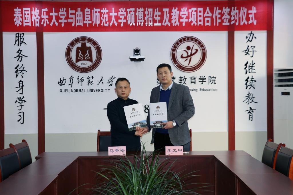 曲阜师大新闻中心讯(通讯员:邢春雷) 2020年12月31日下午,曲阜师大继续教育学院与泰国格乐大学举行硕博招生及教学项目合作签约仪式,院长马秀峰、副院长邢春雷、自考培训部长杨来舜,泰国格乐大学淮海国际事务中心主任李文甲出席签约仪式,副院长邢春雷主持仪式。