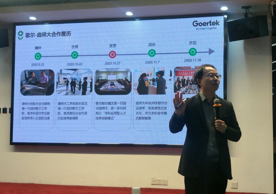 12月11日上午,师生一行参加了由歌尔集团高级副总裁魏文滨主讲的交流会。魏总对校企合作的育人模式、歌尔创业动力、本科及研究生薪资待遇等问题进行详细介绍。在最后的互动环节,同学们热情极高,积极提问,对企业及其人才培养模式有了更加全面的了解。