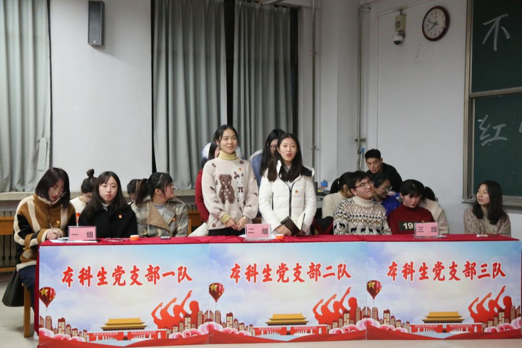 知识竞赛共分四轮。第一轮“党在我心”,所有参赛队伍进行党史党章知识抢答,参与者们反应迅速,积极作答,场面火热;第二轮“聚焦党的十九大”,选手抽取十九大关键词发表演讲,在比赛中充分展现个人魅力与风采,现场掌声不断;第三轮“习”语近人,选手在众多选项中找出“习语”,此环节将趣味性与知识的学习有机结合,做到了寓教于乐;第四轮“唱支红歌给党听”,各队齐唱红歌,声音整齐响亮,极具感染力,唱出了青年学子的激情与力量。
