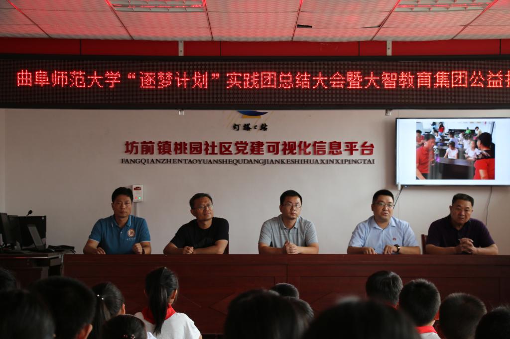 日前,我校“逐梦计划”社会实践团总结大会暨大智教育集团爱心捐赠仪式在临沂市莒南县坊前镇举行。坊前镇党委委员、宣传部部长王绪明,大智教育集团临沂区域副总校长陈灿,我校第四轮第一书记工作组王慕东、刘建河、钟振洪同志,出席仪式。“逐梦计划”社会实践团全体成员,以及我校第四轮第一书记帮包村石门村、朱家洼子村全体小学生参加了大会。