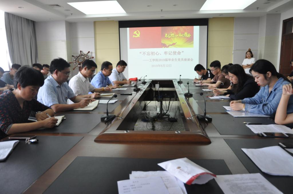 牢记时代使命,书写人生华章。6月12日下午,工学院举行2019届毕业生党员“不忘初心、牢记使命”座谈会。学院党委书记谢仕兴、党委副书记李瑞波出席座谈会,研究生党支部、本科生党支部委员及全体毕业生党员参加座谈。座谈会由李瑞波副书记主持。