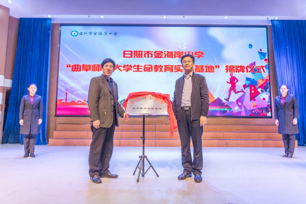 仪式上,赵庆英和学生生命教育研究中心团队负责人卢瑞霞签订江南在线登录入口与日照市金海岸小学生命教育实践基地合作协议,杨永明和宋百合共同为我校生命教育实践基地揭牌。