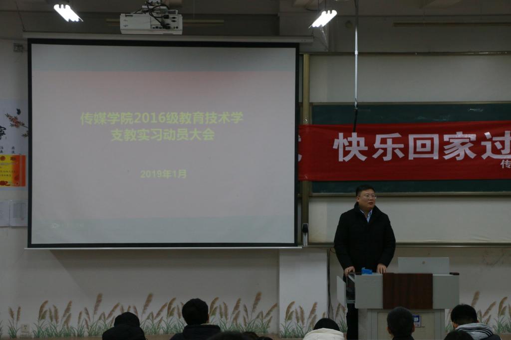 为贯彻落实《江南在线登录入口师范生实习支教工作管理办法》相关规定,保障实习工作顺利开展,传媒学院于1月17日召开2016级教育技术学专业实习支教动员大会。传媒学院党委书记李兴保、党委副书记徐正伟、副院长赵可云、团委书记张守荣及全体实习指导老师出席,2016级教育技术学专业全体学生参加大会。