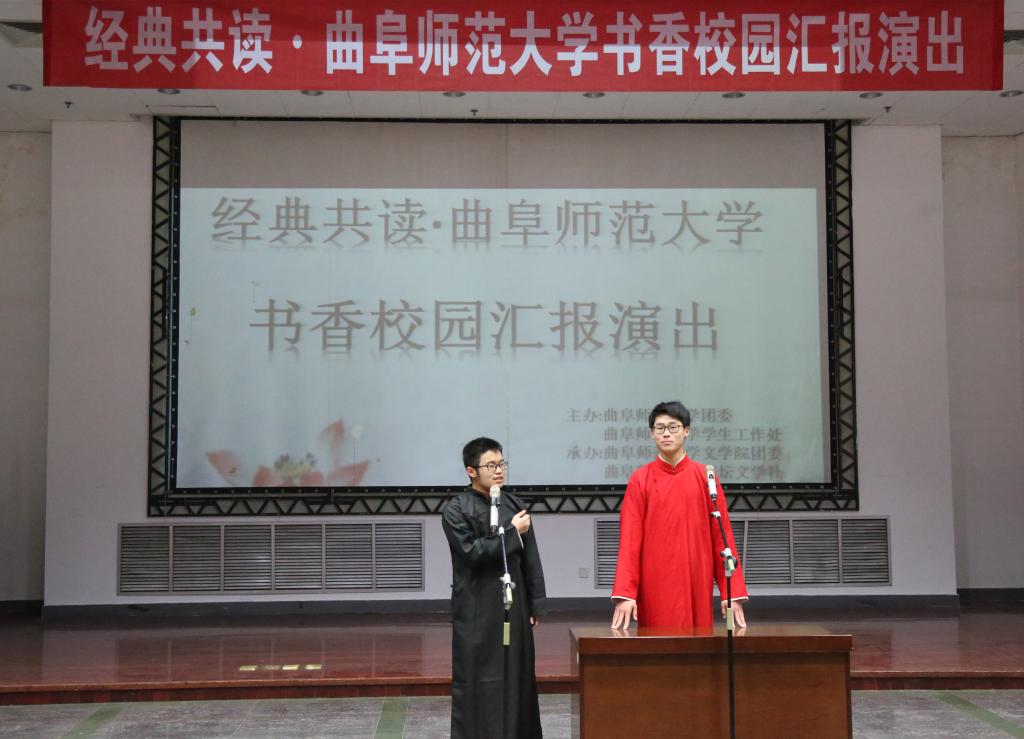 乘世界读书日之风,品经典传统之韵。为鼓励和引导青年大学生多读书、读好书,引导同学们体会阅读的乐趣,感受阅读的力量,在诵读经典中感受中华文化的源远流长,我校受邀参与由广西师大出版社发起的、与北京大学等65所全国高校携手举办“观文馆4.23经典共读”系列活动。4月23日晚,由校团委、校学生工作处等主办,文学院团委承办的“书香校园·文学院经典共读”汇报演出在大学生活动中心举行。图书馆、学生工作处、教务处、团委、文学院等单位负责人及等文学院师生代表参加了活动。