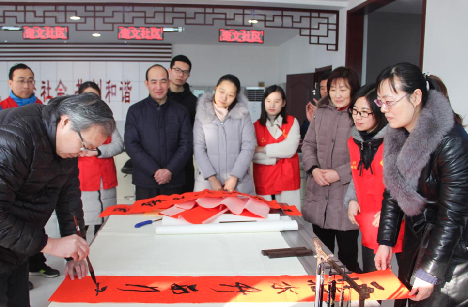 1月25日、26日,党员师生代表带着笔墨纸张,来到山东金阳矿业集团有限公司以及曲阜市奎文社区服务中心送春联送祝福。校党委组织部副部长姜玲,书法学院党委书记姜晓强以及专业教师代表参加了活动。师生代表不顾旅途劳累和天气严寒,现场泼墨挥毫,为职工写春联、送祝福。一幅幅鲜红的春联、一张张欢快的笑脸,给冬日的矿区、社区增添了节日的气氛。