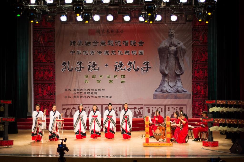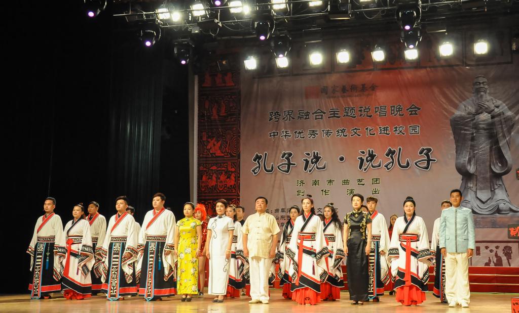 大型跨界融合主题说唱舞台剧《孔子说·说孔子》由济南市曲艺团创作演出,获2016年度国家艺术基金资助。舞台剧综合运用山东琴书、河南坠子、山东大鼓等多种曲艺形式,创新舞台表现手法,形象演绎了孔子修身处世的故事和《论语》中的名句典故,生动表现了孔子的伟大思想和品格。演出中,《孔子学琴》《苛政猛于虎》《咱听孔子说》等精彩表演赢得了现场师生阵阵掌声。