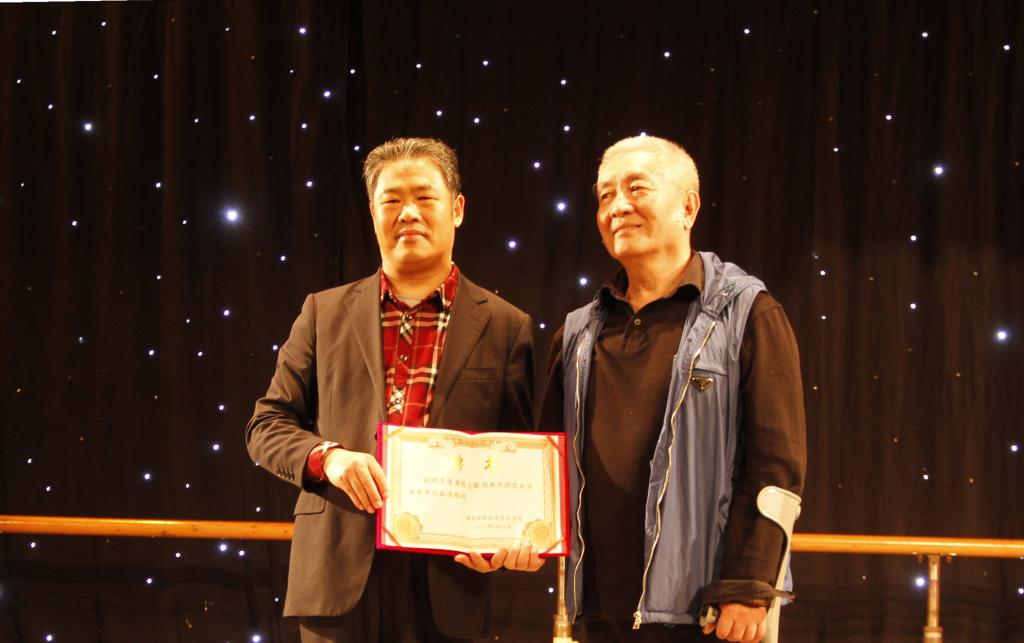 晚会伊始,扈庆学为应邀出席的中国民族民间舞专家、山东省舞蹈家协会名誉主席张荫松颁发客座教授聘书。