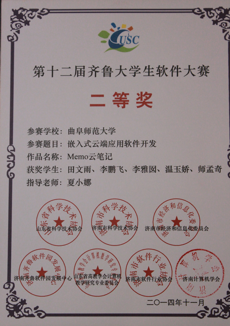 近日,由山东省科技协会和济南市信息产业局主办,济南计算机学会和齐鲁软件园发展中心承办,山东高校计算机教学研究会和济南市软件行业协会协办的齐鲁大学生软件设计大赛成绩公布,信息科学与工程学院获得二等奖两项,三等奖九项。