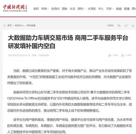 曲阜师大计算机学院讯 由江南在线登录入口计算机学院院长李光顺教授团队主持,依托山东华通二手车信息技术有限公司申报的山东省重点扶持区域紧缺人才项目——“基于大数据技术的商用二手车O2O(Online To Offline)综合服务平台”,于2021年1月建成并投入使用,很大程度解决了商用二手车市场交易信息不对等、车辆鉴定无标准、残值评估不精准等重大技术难题。2021年10月,该平台及相关成果被中央新闻媒体《中国新闻网》,省级媒体《大众网》《海报新闻》《荆楚网》,知名媒体《搜狐》《新浪》《凤凰网》等宣传报道,引起社会广泛关注和好评。