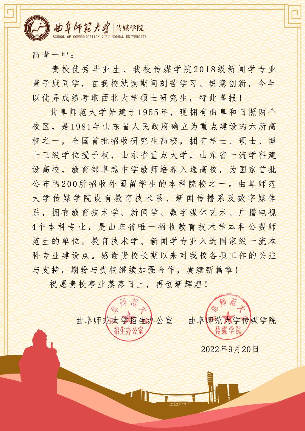 曲阜师大传媒学院讯 近日,传媒学院组织开展的“薪火相传念师恩”高中母校行社会实践顺利收官。2022级曲园学子重返高中母校拜访恩师,并将曲阜师大2022届毕业生考研、就业喜报送达高中母校,宣传学校招生情况和人才培养成果。