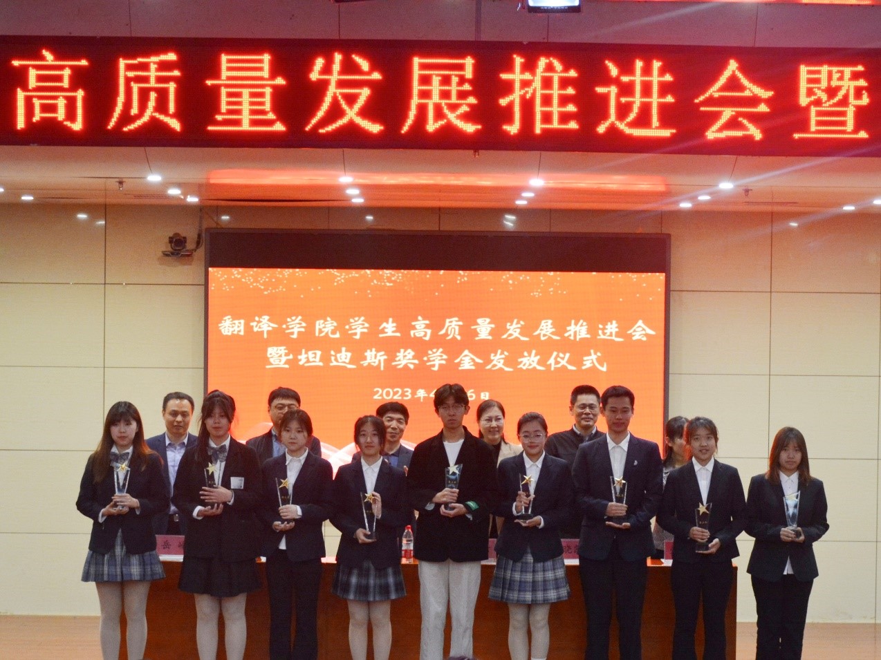 曲阜师大翻译学院讯 4月26日下午,翻译学院2023年学生高质量发展推进会暨坦迪斯奖学金发放仪式于图书馆报告厅举行。翻译学院党委书记宋钧文、院长夏云、学生工作处副处长郑勇、副院长宋晓凯、副教授张巍、全体辅导员出席仪式。学院党委副书记岳峰主持活动。