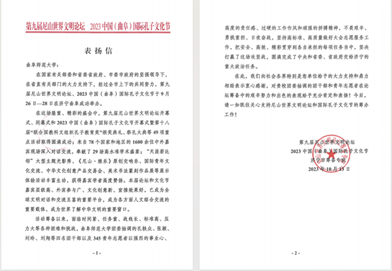 曲阜师大团委讯 日前,曲阜师大收到来自第九届尼山世界文明论坛、2023中国(曲阜)国际孔子文化节济宁市筹备专班的表扬信,对学校认真组织大学生志愿者为第九届尼山世界文明论坛成功举办提供有力保障表示诚挚感谢。