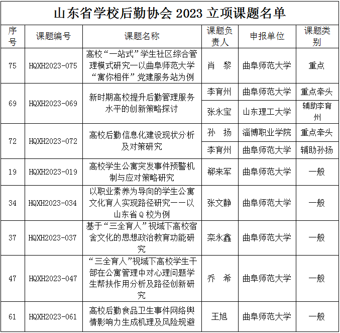 曲阜师大学生工作处讯 近日,山东省学校后勤协会公布《关于2023年课题立项的通知》(鲁学后协〔2023〕9号文),共有88个课题获得立项,一般课题67项,重点课题20项,专项课题1项。