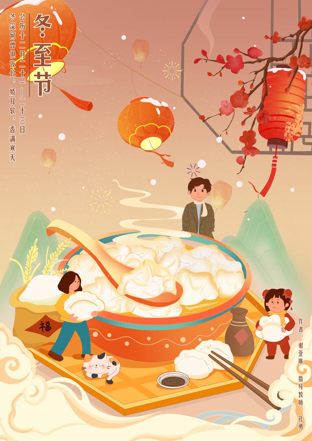 本次活动融合传统文化教育与专业实践教育,实现学中做、做中学。学生在创作过程中,选取与节日主题息息相关的画面元素,进行创新性组合。如系列作品之一《冬至》,从“冬至不端饺子碗,冻掉耳朵没人管”的节日习俗出发,将饺子元素作为画面主体元素,并创作插画文案“冬深何曾惧夜长,娇耳软,香满寒天”,在阐释画面内涵的同时丰富画面密度。系列原创数字插画作品内容贴近主题、色彩温暖明丽、画面造型尽显可爱,将现代数媒技术与传统文化精华深度融合,展现传媒学子创新活力。